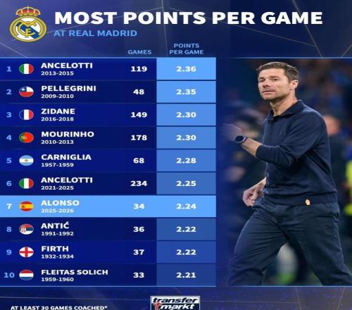 皇马队史执教至少30场主帅场均积分榜:阿隆索2.24分第7